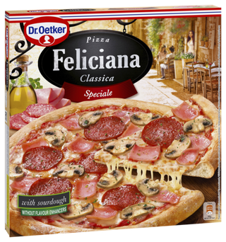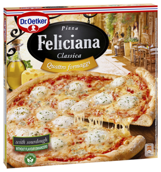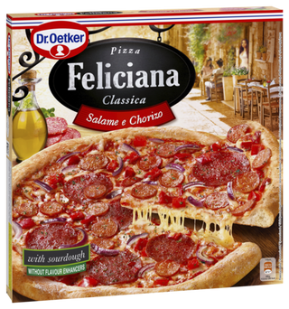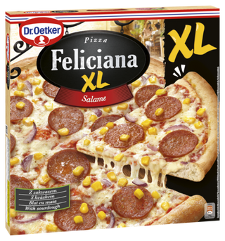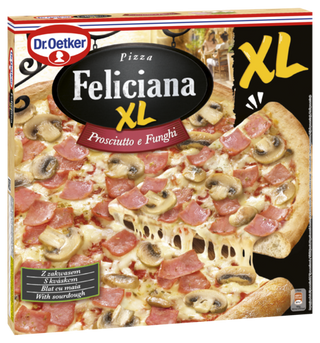 Feliciana Dr. Oetkera to pierwsza pizza mrożona wzorowana na pysznych włoskich pizzach. Sekret niepowtarzalnego smaku Feliciany to cienkie i chrupiące ciasto z dodatkiem zakwasu. Całość wzbogacają pysznie skomponowane składniki, zioła i sosy. Pizza Feliciana została przygotowana bez dodatku wzmacniaczy smaków i bez barwników. Pyszny smak pizzy, spontaniczna włoska atmosfera - teraz w Twoim domu kiedykolwiek tego zapragniesz i z kimkolwiek zechcesz. Szybko, łatwo i zawsze smacznie!
