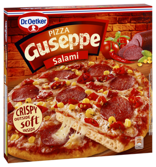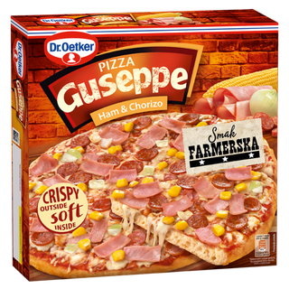 Pyszne ciasto, delikatnie puszyste w środku i jednocześnie przyjemnie chrupiące na zewnątrz, to właśnie tajemnica niepowtarzalnego smaku pizzy Guseppe. Dodatkowo specjalnie dobrane i lubiane składniki – ułożone aż po brzegi. Całości smaku dopełniają aromatyczne przyprawy i sos pomidorowy. Guseppe to pyszna zabawa smakiem dla każdego!