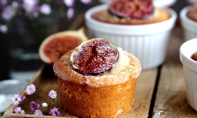 Piekarnik nagrzej do temp. 175˚C. Sześć kokilek wysmaruj masłem i ustaw na kratce z wyposażenia piekarnika. Do miski wsyp mieszankę do wypieku babeczek, dodaj jajka, olej i mleko. Całość wymieszaj dokładnie rózgą na gładką konsystencję. Gotowe ciasto rozłóż równomiernie w 6 kokilkach, następnie na każdą babeczkę połóż dość gruby plaster figi.