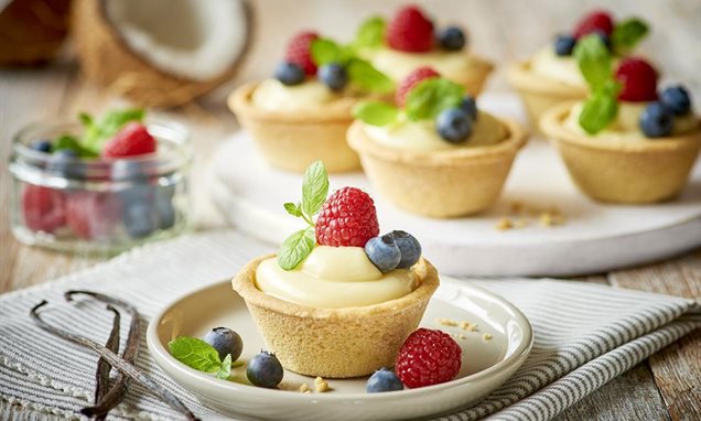 Mleko kokosowe dobrze wymieszaj, odlej 1/4 szklanki, resztę przelej do garnka i zagotuj. W 1/4 szklanki mleka rozpuść budyń z dwoma łyżkami cukru. Dodaj do gorącego mleka i mieszając zagotuj do zgęstnienia. Do wystudzonych babeczek nałóż krem i udekoruj owocami.