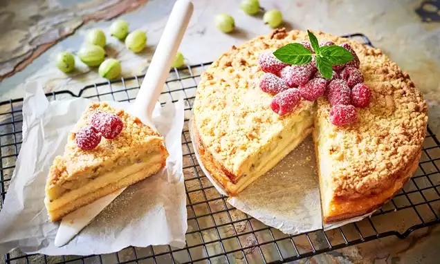 Mąkę wymieszać mikserem z proszkiem do pieczenia, cukrem pudrem, cukrem wanilinowym, jajkiem, margaryną i solą. 2/3 ciasta włożyć do wysmarowanej tłuszczem okrągłej formy o śr. 24 cm, podnosząc boki na wys. ok. 2 cm. Resztę ciasta schłodzić w lodówce.