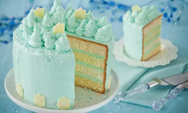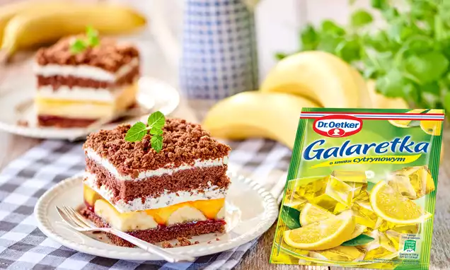 Schłodzoną śmietankę ubić na sztywno. Do oddzielnego naczynia wlać 60 ml zimnej wody i 100 ml ajerkoniaku, wsypać mieszankę do masy i miksować przez 1 minutę. Dodać do ubitej śmietany i delikatnie wymieszać. Masę wyłożyć na ciasto, łyżeczką zrobić małe wgłębienia.