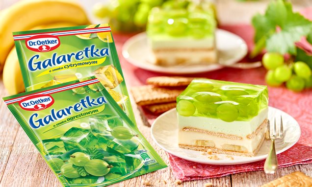 Na wierzch poukładaj winogrona i zalej tężejącą galaretką agrestową. Odstaw do lodówki na około 12 h.