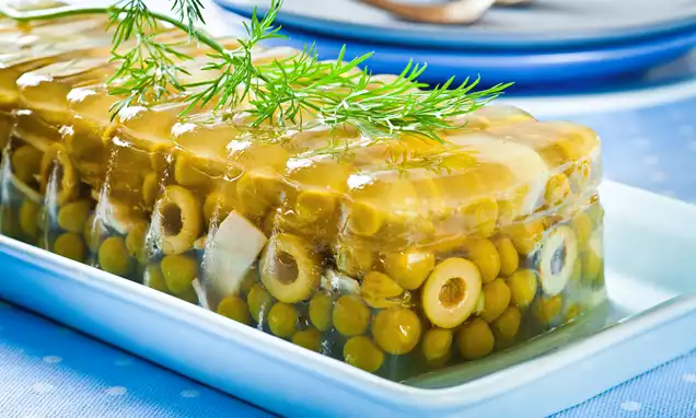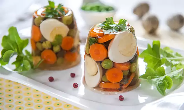 3 listki żelatyny namocz w zimnej wodzie (zanurzając jeden po drugim). Ogórka pokrój na mniejsze kawałki i rozdrobnij blenderem, do uzyskania musu. Po 5 minutach odsącz listki w dłoni. Odsączone listki żelatyny rozpuść podgrzewając je w mikrofalówce, nie dopuszczając do zagotowania. Dodaj do żelatyny kilka łyżek musu z ogórka i wymieszaj. Całość wlej do pozostałego płynu, ciągle dokładnie mieszając. Przelej mus do płaskiego naczynia, na grubość około 3 mm. Wstaw do lodówki na kilka godzin, do stężenia galaretki. Po stężeniu pokrój galaretkę na małe kwadraciki lub wytnij kółka foremką o śr. 3 cm.