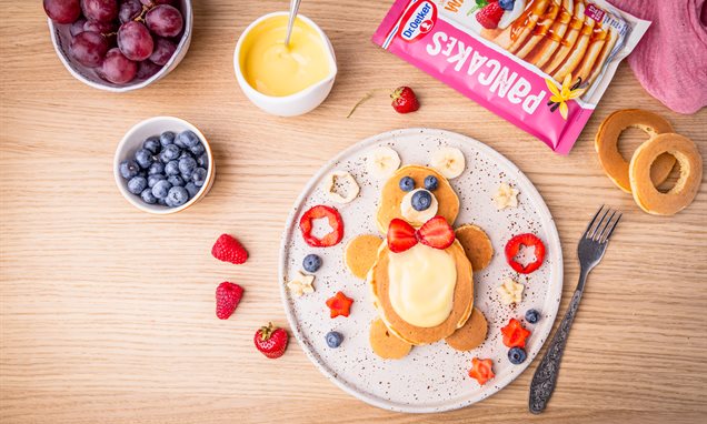 Mniejszą, okrągłą foremką wytnij z usmażonych pancakes 4 łapki. Ułóż na talerzu wszystkie części. Buźkę zrób z owoców, a brzuszek posmaruj sosem waniliowym lub ulubionym kremem. Puszysty Miś jest gotowy!