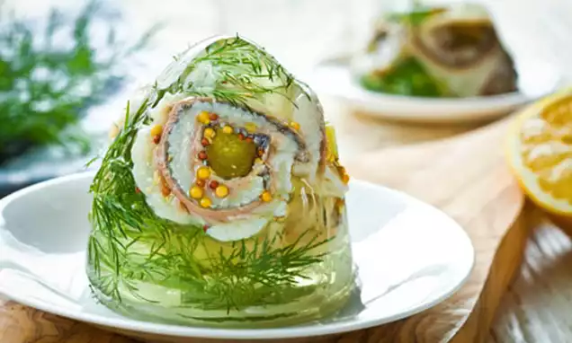 Listki żelatyny namocz w zimnej wodzie (zanurzając jeden po drugim). Jogurt naturalny wymieszaj z solą, pieprzem i cukrem. Czosnek obierz, przeciśnij przez praskę. Dodaj do jogurtu. Dokładnie wymieszaj. Odsącz listki w dłoni. Odsączone listki rozpuść podgrzewając je w garnku lub mikrofalówce, nie dopuszczając do zagotowania. Dodaj do żelatyny kilka łyżek jogurtu, wymieszaj i całość wlej do pozostałego jogurtu, ciągle mieszając. Masę wylej na stężony szpinak. Wstaw do całkowitego stężenia na ok. 2 h do lodówki.