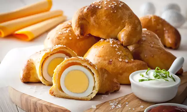 Do naczynia miksującego wsyp mąkę, dodaj wodę, 1 jajko, drożdże, 30 g masła, cukier i 1 łyżeczkę soli, wyrób Ciasto /2 min. Ciasto pozostaw w naczyniu miksującym do wyrośnięcia na ok. 1 godz. lub do momentu, aż podwoi swoją objętość.