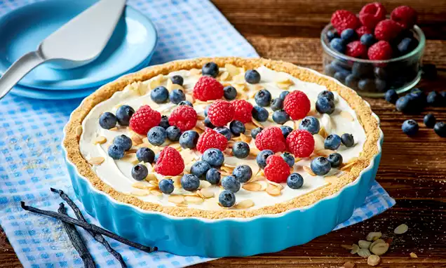 Ciasto rozwałkuj na blacie oprószonym mąką, owiń na wałek i ostrożnie przełóż na formę do tarty o śr. 26 cm. Przytnij brzegi ciasta, spód ponakłuwaj widelcem. Ciasto wstaw do zamrażarki na ok. 30 minut.