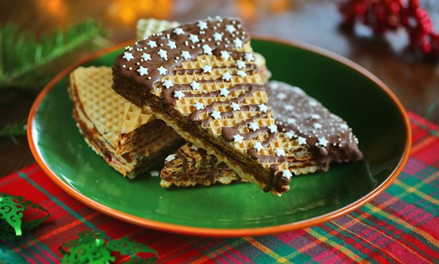 Polewę rozpuść w kąpieli wodnej. Waflowe trójkąty udekoruj polewą wykonując fantazyjne kształty, a nastepnie zanurzaj szerszym bokiem w polewie. Zanim polewa zastygnie udekoruj posypkami. Odstaw do zastygnięcia.
