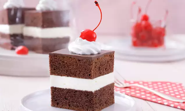 Schłodzoną śmietankę ubij mikserem na sztywno (ok. 5 minut na najwyższych obrotach). Do oddzielnego naczynia wlej wodę, wsyp mieszankę do masy i miksuj przez ok. 0,5 minuty. Tak przygotowaną mieszankę przełóż natychmiast do ubitej śmietany, delikatnie wymieszaj, a następnie stopniowo dodawaj płatki czekoladowe. Masę wyłóż na wiśniową warstwę pozostawiając ok. 1 cm wolnego miejsca od brzegu. Łyżką uformuj kopułę, posyp okruchami ciasta i wstaw na ok. 2 h do lodówki.